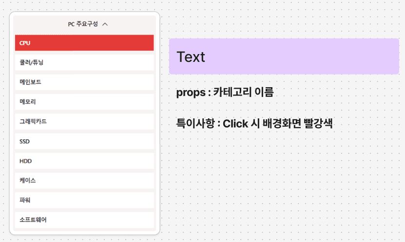 size)는 동일합니다. props로 카테고리 이름을 전달받습니다.- 클릭 시 배경색이 빨강색으로 변하는