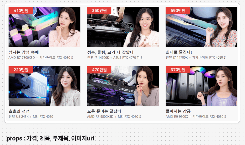 props로 가격, 제목, 부제목, 이미지를 전달받습니다.- 각 아이템은 분자 단위로 제작되며, 이를 감싸는 외부