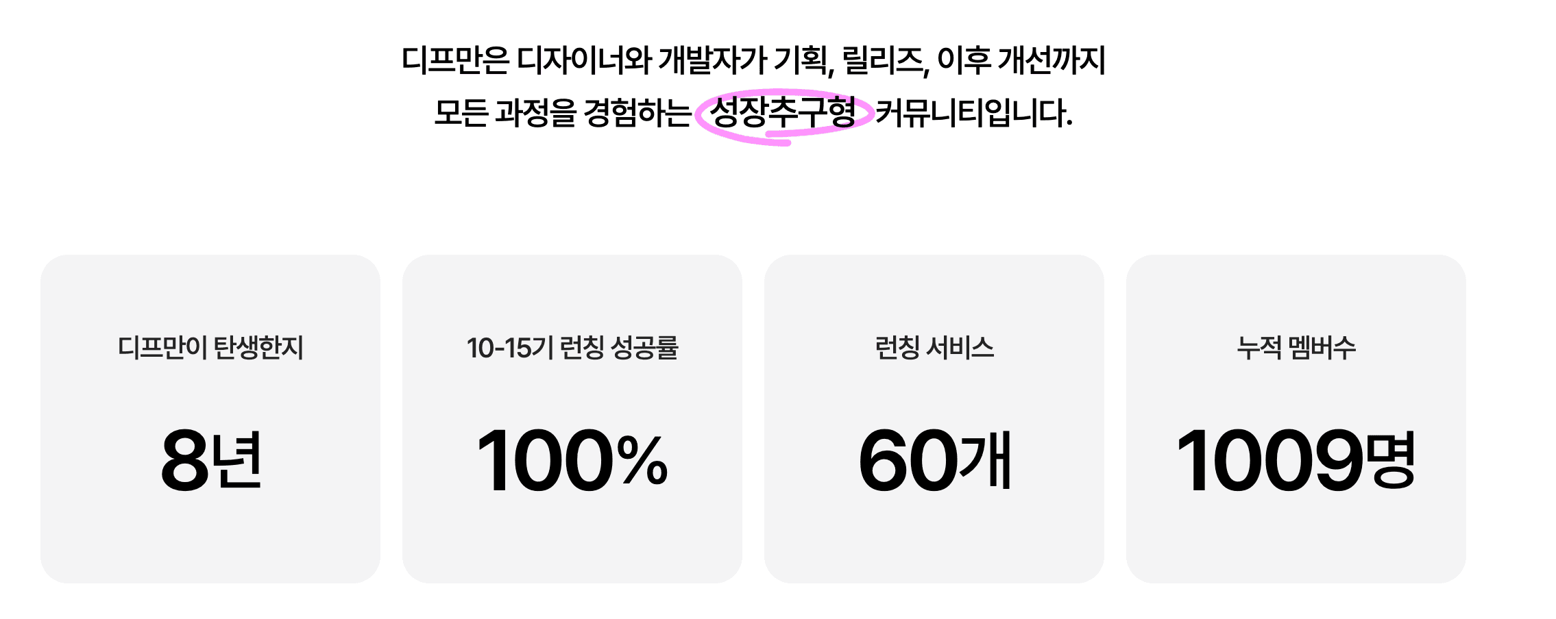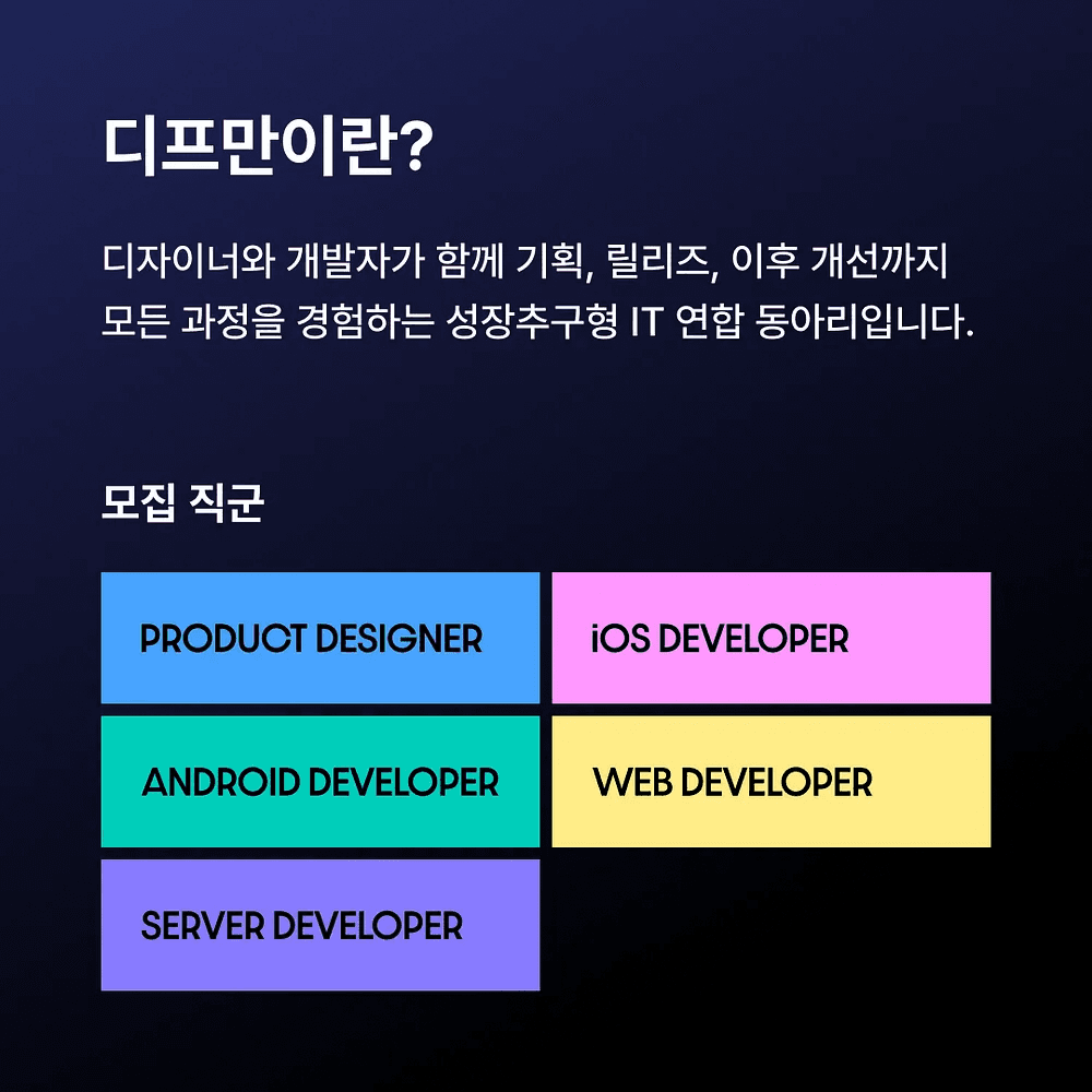 디자이너와 프로그래머가 만났을 때의 줄임말로 이름 자체에서 뜻을 찾을 수 있습니다. 개발자와 디자이너가 함께 사이드 프로젝트를 단기간에 개발하고, 배포하여 운영까지 함께 진행하는 활동인데요. 특이한점은 개발 취준생 부터 현직자까지 다양한 배경을 가진 참가자들이 함께 활동한다는 점입니다. 저는 이전까지 사이드 프로젝트를 진행한다 해도, 부트캠프 때 만났던 팀원들이나 해커톤처럼 대학생 및 취준생들과 힘을 모아 프로젝트를 진행했지만, 디프만에서는 실제 현업자들과 함께 작업하며 현업자들의 노하우와 실무 경험을 직접 배울 수 있다는 점이 가장 큰 매력으로 다가왔습니다.