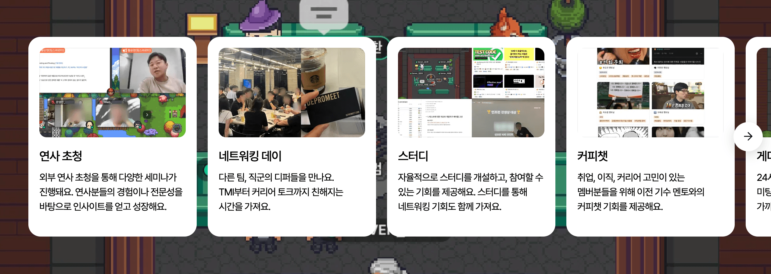 또한 디프만은 단순 사이드 프로젝트 동아리가 아닌 성장추구형 커뮤니티로써 개발자끼리의 친목이나 함께 성장할 수 있는 다양한 활동들이 존재합니다. 저는 특히 디프만 선배님들에게 커리어 관련 고민거리를 털어놓고 조언을 얻을 수 있다는 커피챗이 가장 기대됐던것 같습니다.