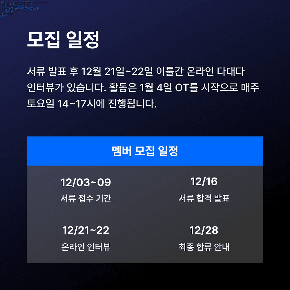 - 서류 접수 : 12월 3일(화) 00:00 -12월 9일(월) 23:59