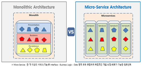 하나의 코드베이스 : 모든 기능이 하나의 코드베이스에 포함되어 있어 관리가 단순하지만, 확장성에 제약이 있습니다.
