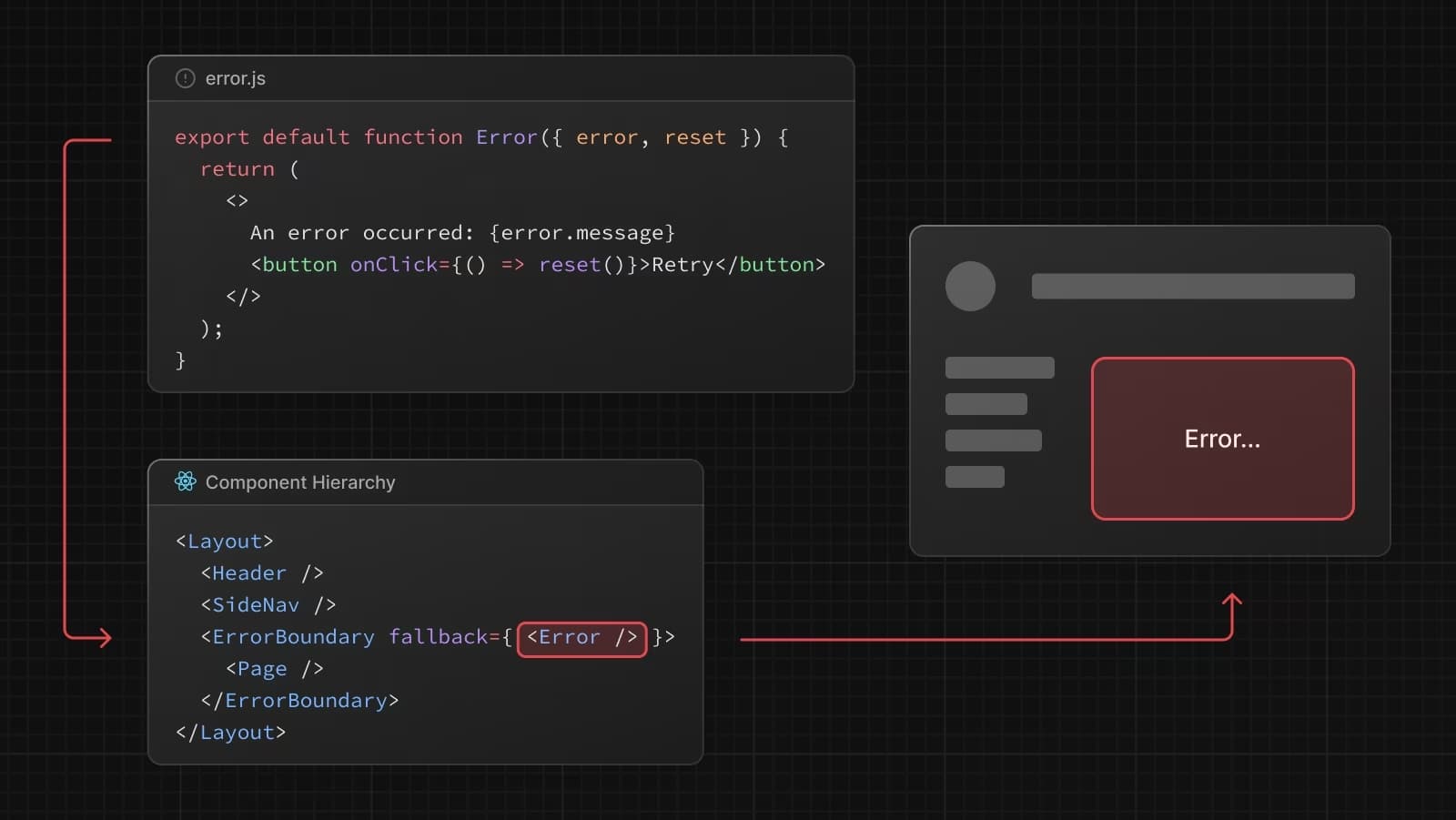 error.js 파일은 중첩된 모든 하위 컴포넌트에 대한 오류를 처리합니다. 예를 들어, 특정 경로 맨 아래에 있는 여러 depth의 컴포넌트가 존재할 때, 최상위 error.js 파일은 해당 경로 아래의 모든 하위 컴포넌트에서 발생하는 에러를 처리할 수 있습니다.