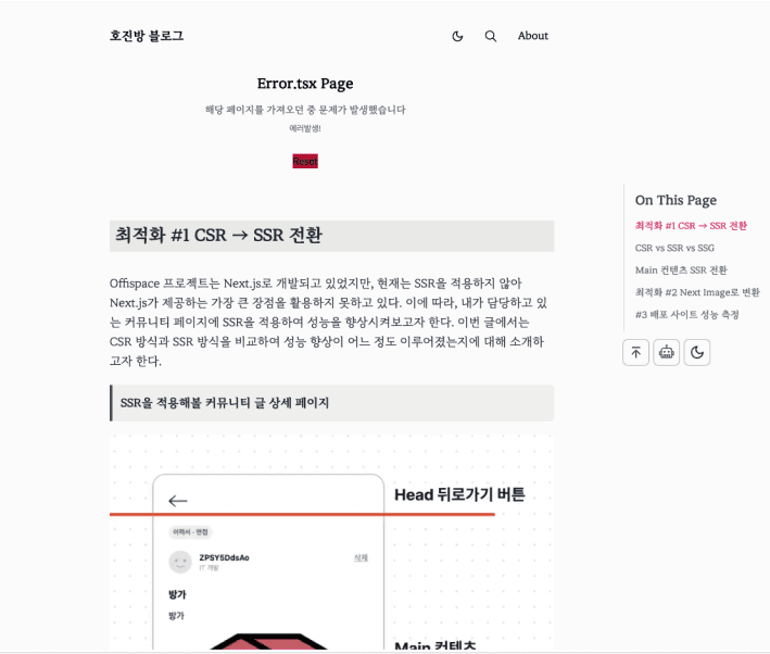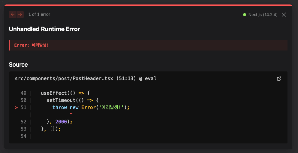 PostHeader 컴포넌트에서 발생한 에러를 처리할 Error.tsx 를 작성 후 Layout 상위 세그먼트에 위치시킵니다