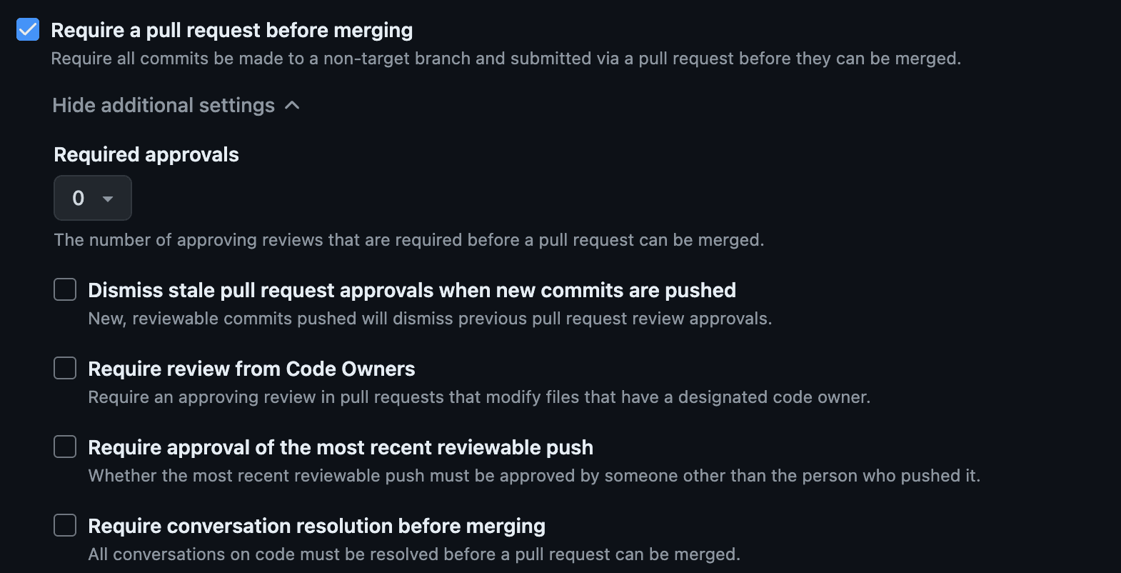 먼저 main 브랜치에 직접적으로 커밋하지 않고, 항상 Pull Request를 통해 병합하도록 설정한다. 이로써 코드 리뷰와 테스트를 거친 안정된 코드만이 main 브랜치에 병합되도록 할 수 있다.