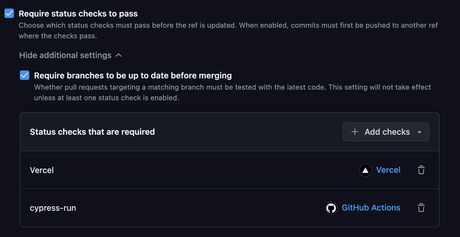 위 단계를 통해 GitHub Actions를 사용하여 E2E 테스트와 Vercel 배포를 연동하고, 이를 통해 안정된 코드를 main 브랜치에 병합하는 과정을 자동화할 수 있다.