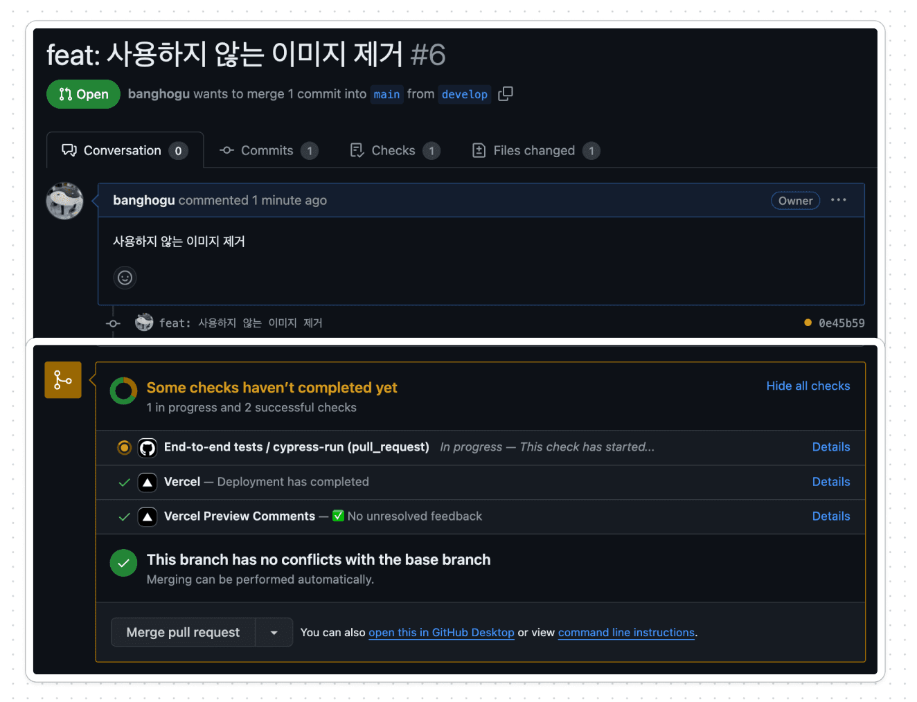 GitHub 저장소로 이동하여 develop 브랜치로 접근한다. main 브랜치로의 Pull Request를 생성한다. PR이 생성되면 자동으로 설정된 Vercel 배포와 E2E 테스트가 실행된다