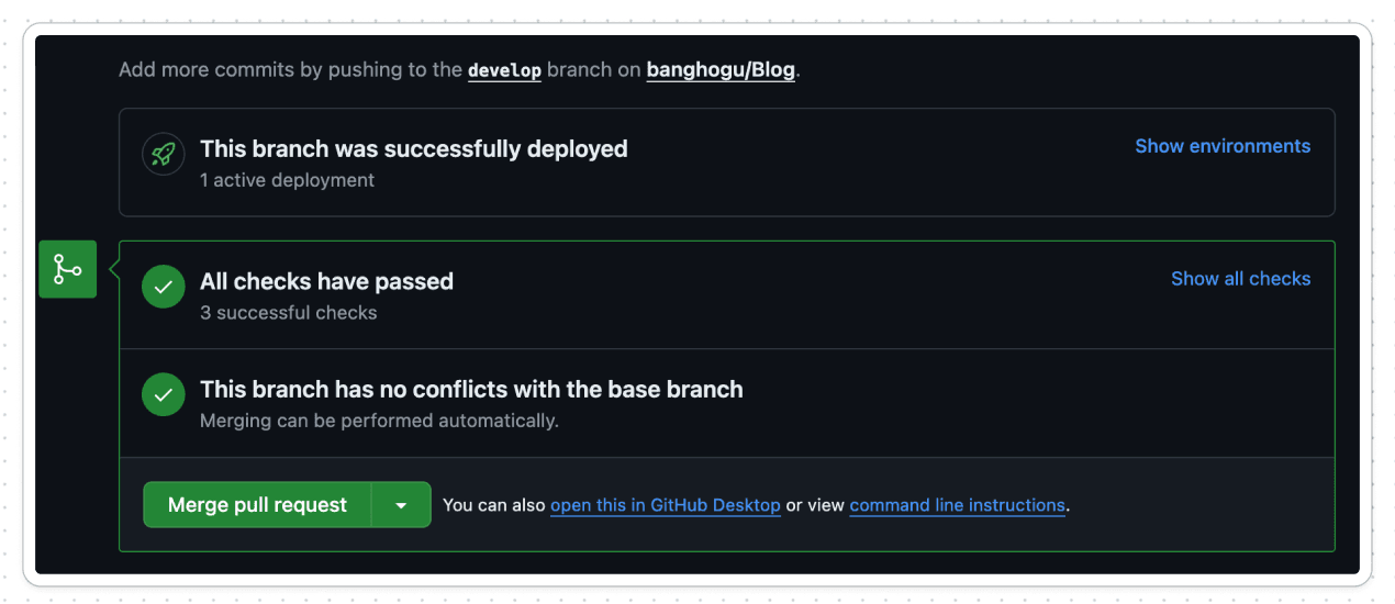 Pull Request에 대한 모든 테스트와 Vercel 배포가 완료되었음을 확인한 후, PR을 main 브랜치에 병합할 수 있다.