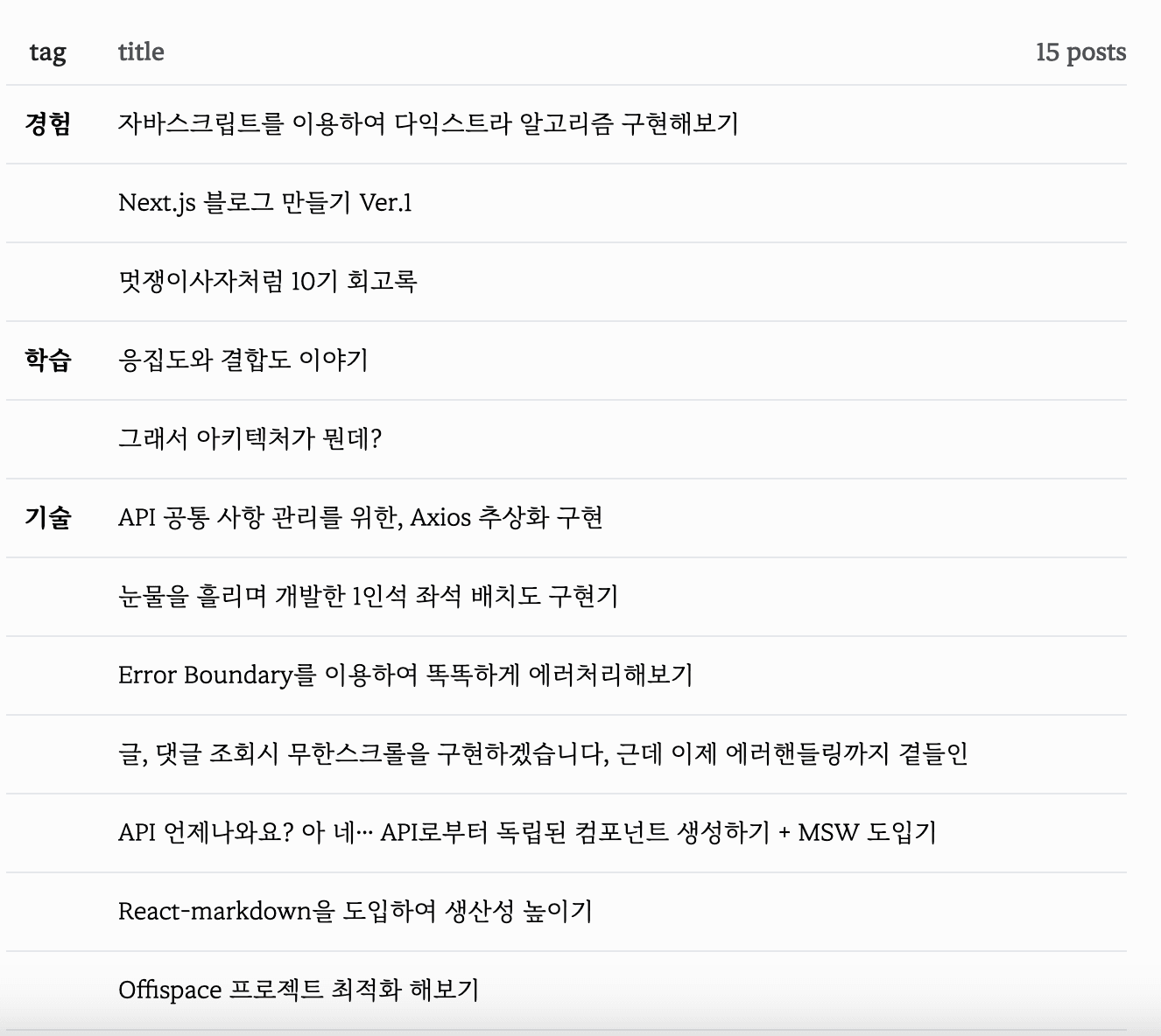 };모든 글 데이터를 받은 PostListLayout은 글 데이터에 저장된 태그별로 글을 분류하고, 각 Link마다 글 ID를 href 속성으로 넘겨주어 글 아이템이 클릭 될 시 해당 글 상세페이지로 이동한다.