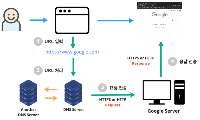 사용자는 웹 브라우저의 주소창에 www.google.com과 같은 도메인을 입력하고 Enter 키를 누르면, 브라우저는 도메인을 IP 주소로 변환하기 위해 DNS 서버에 조회 요청을 보낸다.
