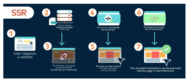 하지만 현대의 서버사이드 렌더링(SSR)의 동작 원리는 클라이언트의 초기 요청을 서버가 수신하여, 필요한 데이터를 수집하고 이를 HTML 템플릿과 결합하여 서버에서 HTML 페이지를 생성한다.