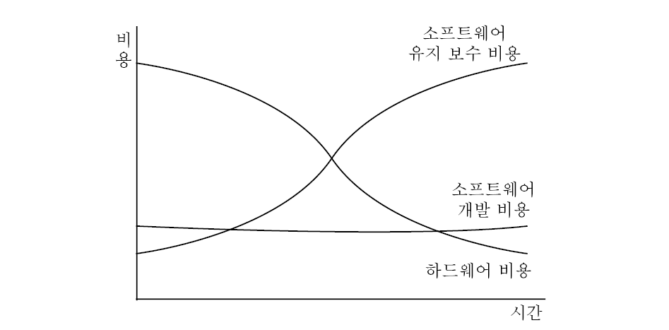 개발 초기 단계에는 많은 기능을 빠르게 개발 해야 되기 때문에 개발 비용이 높지만, 개발이 완료되고 나서부터는 계속해서 변화하는 소프트웨어를 유지보수 해야 한다. 이때 기능 개발비용보다 유지보수비용이 늘어나는것을 그래프를 통해 확인할 수 있다. 따라서 장기적으로 봤을 때 기능을 개발하는 비용보다 유지보수비용이 훨씬 크다는 것을 알 수 있다.