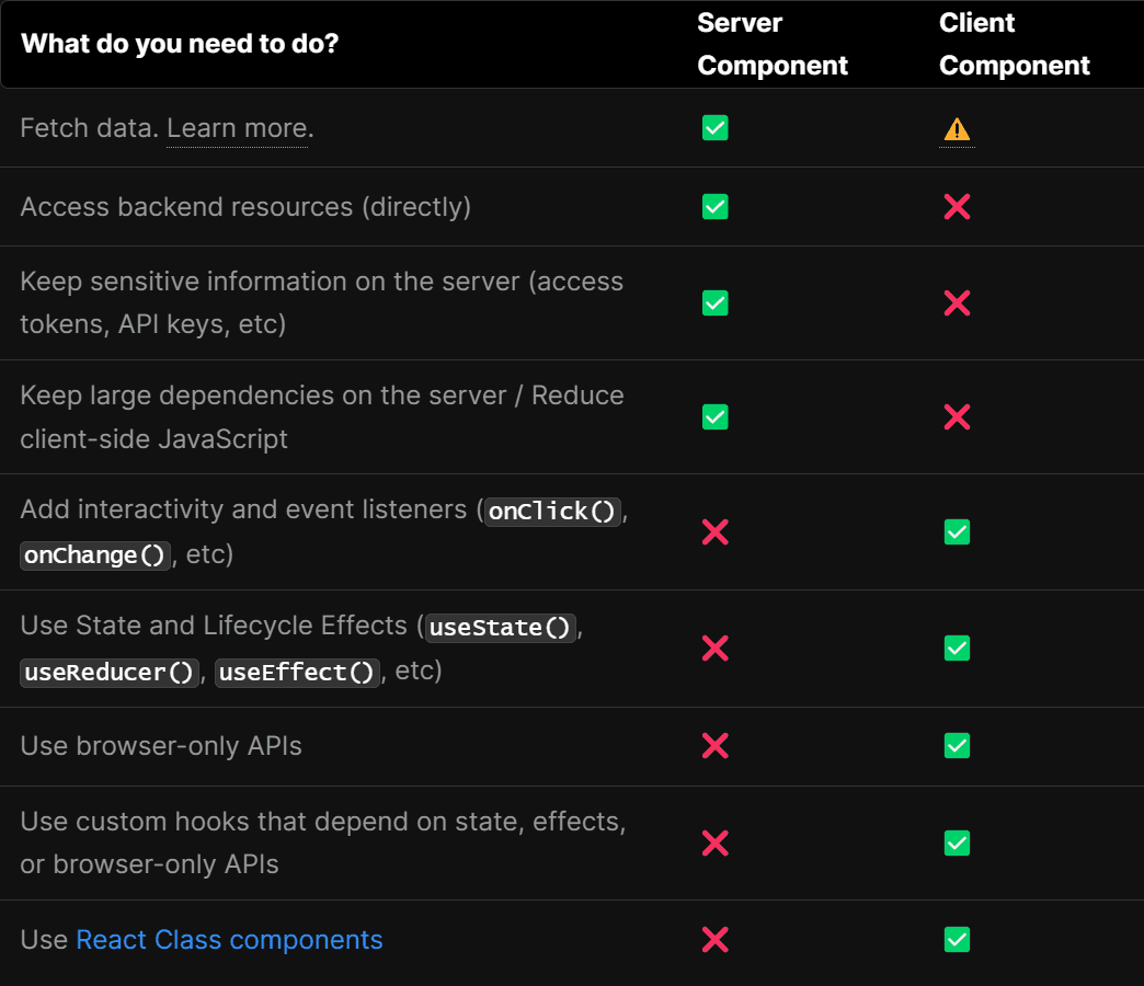 서버 컴포넌트는 말 그대로 서버에서 동작되기 때문의 클라이언트(브라우저의) 상태(state)나 이벤트 핸들링을 직접적으로 처리할 수 없기 때문에 서버 컴포넌트 내에서는 useState나 useEffect와 같은 React 훅을 사용할 수 없다. 이러한 기능은 클라이언트 컴포넌트에서 처리하도록 수정해야하고, 이벤트 핸들링 또한 브라우저에서 발생하는 동작이기 때문에, 클라이언트 컴포넌트에서만 수행될 수 있다.