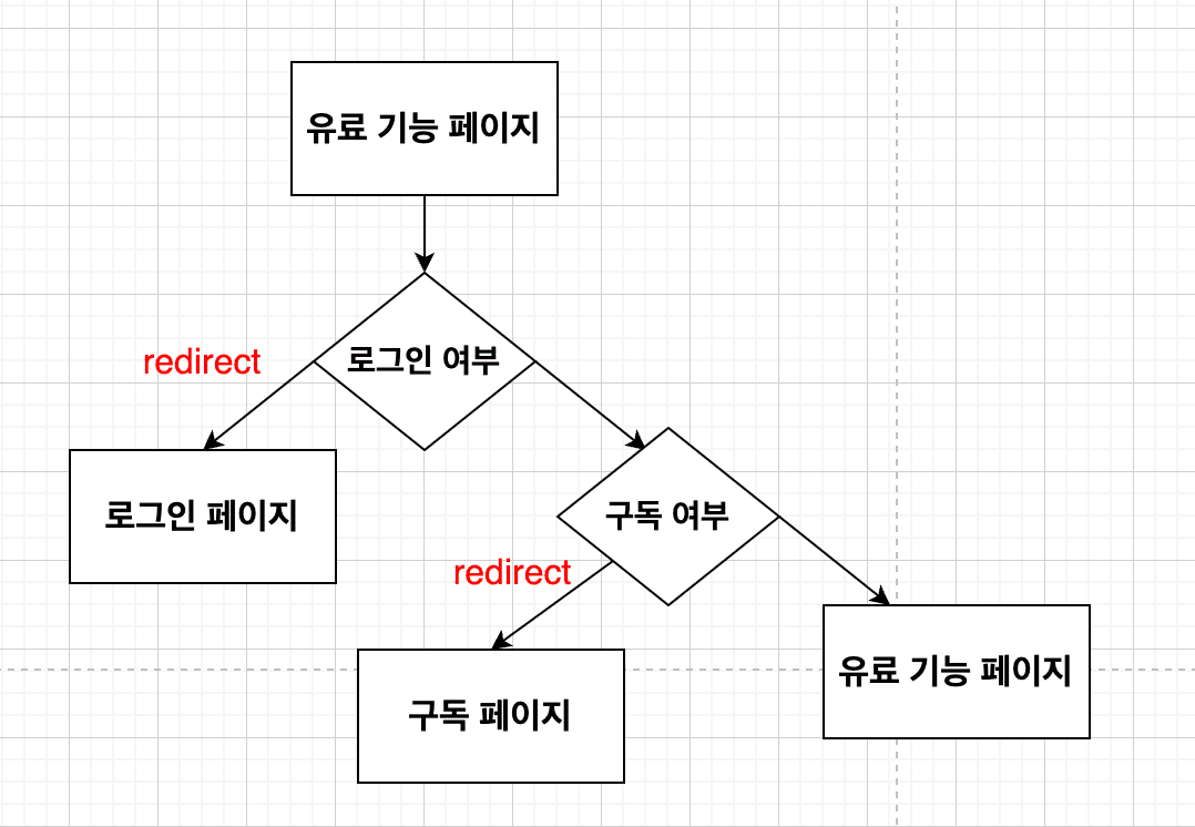 구독 유무에 따른 프리미엄 기능 예외처리 방식은 앞서 설명한대로 로그인 여부, 구독 여부 총 2가지를 판별하는데, 로그인 여부를 먼저 판단하고 로그인 되지 않았을시는 로그인 페이지로 redirect, 로그인이 되었다면 구독여부를 판별하고 구독이 되지 않았다면 구독페이지로 redirect 된다.
