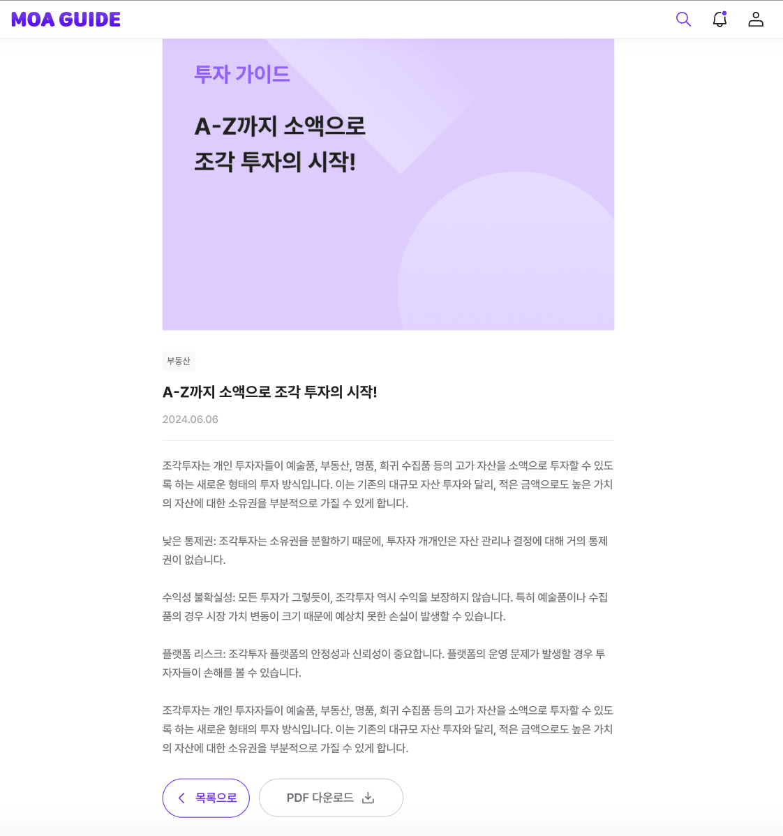 해당 화면은 모아가이드 프로젝트의 대표적인 프리미엄 기능인 투자 리포트(가이드) 페이지인데, PM과 컨텐츠팀이 제작한 실제 투자 리포트로 구독 서비스를 이용중인 유저에게는 해당 가이드 글 조회와 PDF 다운로드 기능을 제공한다. 해당 페이지에 예외처리를 적용해보자.