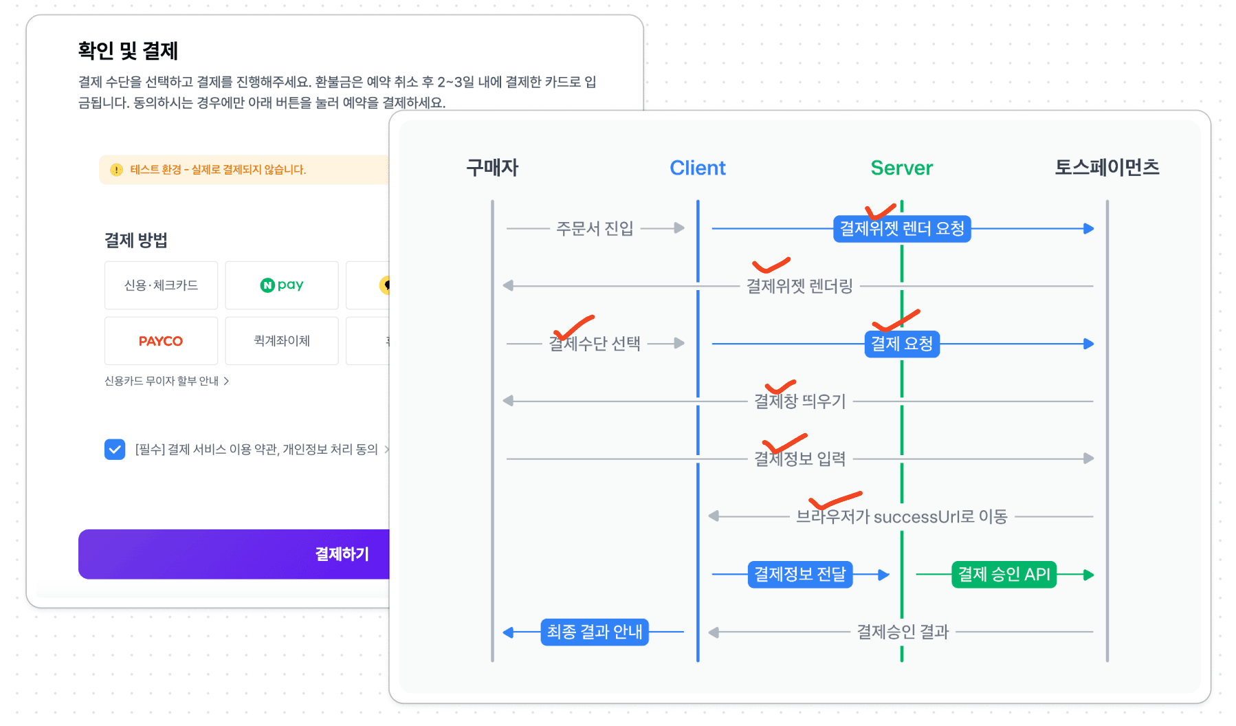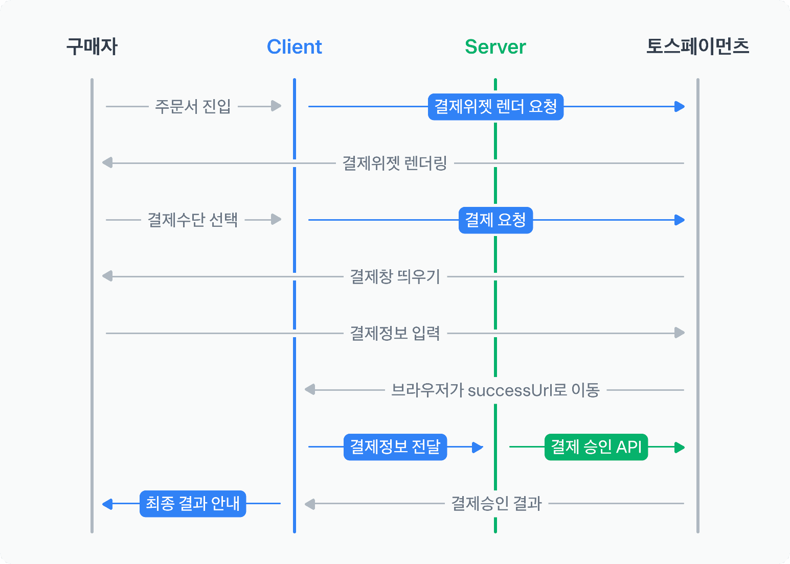 토스에서 제공하는 결제 플로우는 위 사진과 같은데, 주요 단계를 간략하게 요약하자면 아래와 같다.