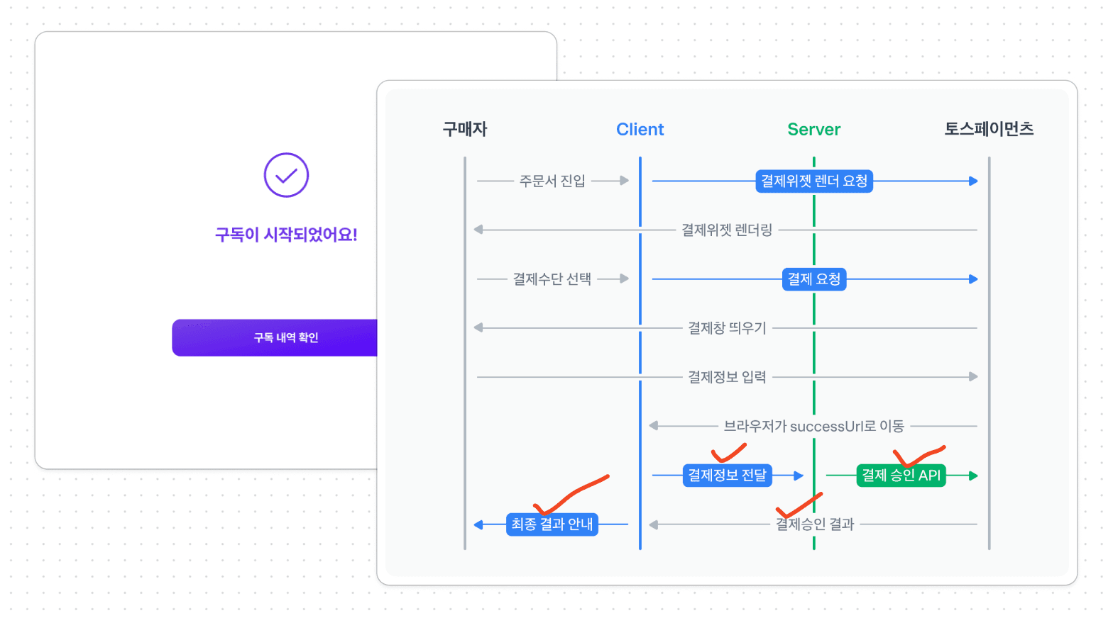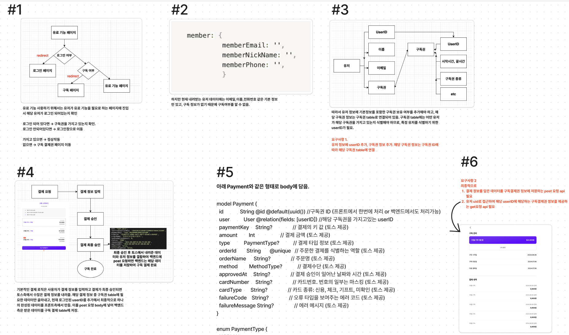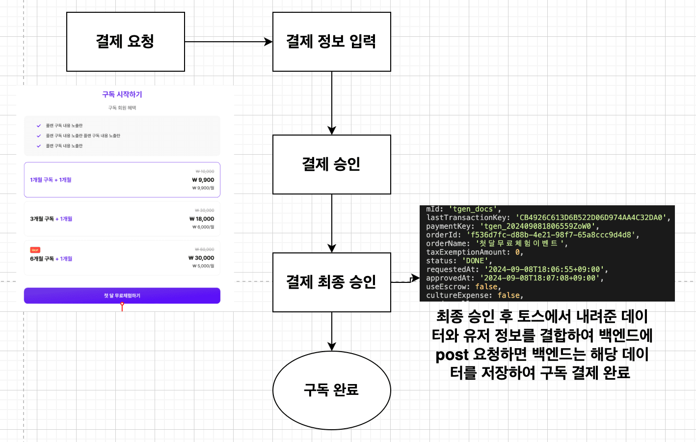 백엔드팀에게 요청할 스키마와 더불어 위 토스 플로우를 참고하여 해당 결제 API 이해를 돕기 위한 결제 로직 플로우 문서를 같이 준비했다. 해당 자료를 백엔드팀에 공유하여 설명했고, 구독권 테이블에 데이터를 추가하는 post요청, 구독 결제권을 조회하는 get 요청 API를 부탁하며, 결제 관련 사전 준비를 끝마칠 수 있었다.
