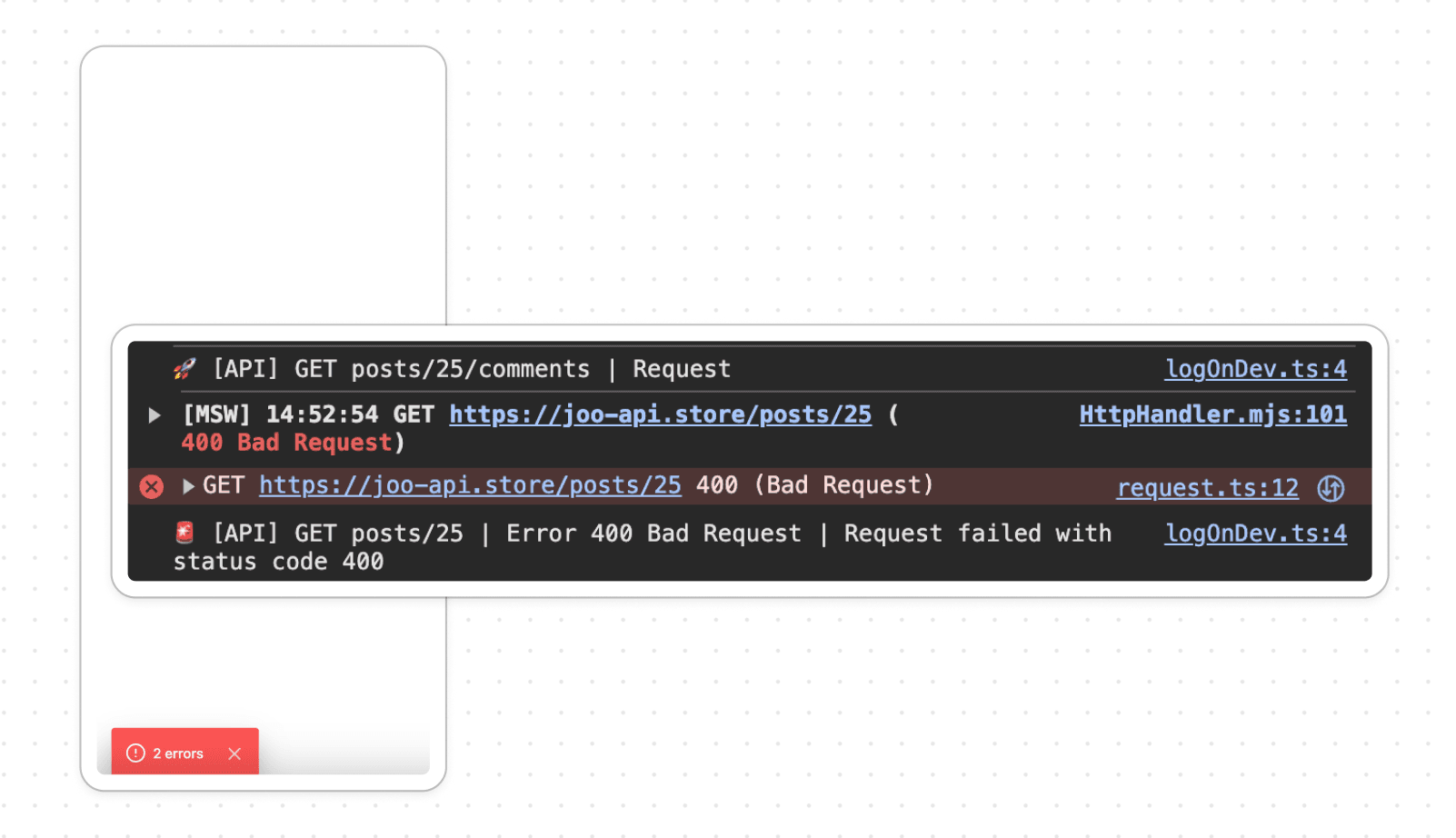 MSW를 이용하여 글 상세 데이터를 가져오는 API에 임의로 에러를 발생시켜보자.
