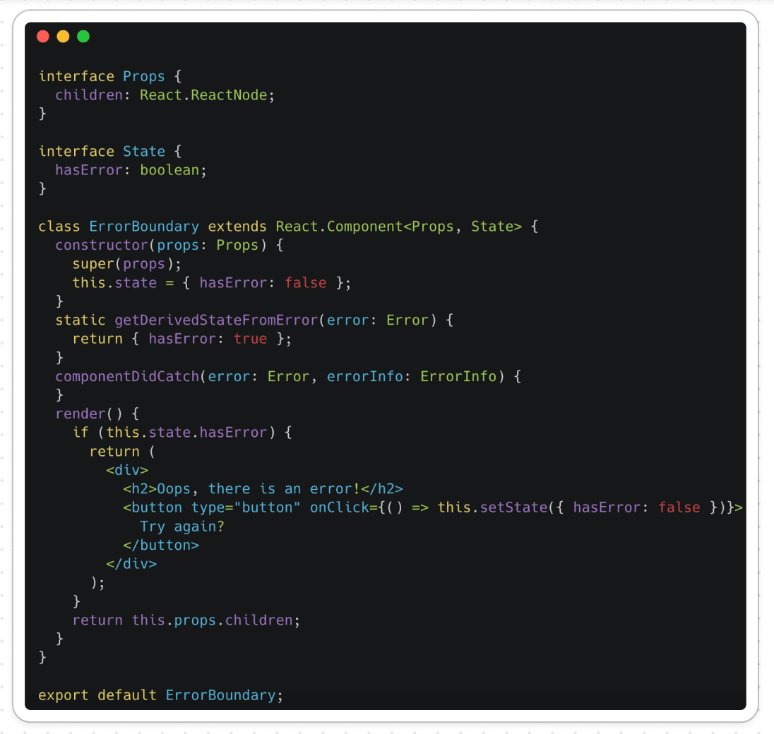 Error Boundary는 위와 같이 작성된다. 다만 Next에서 제공되는 코드는 type이 적용되지 않아 Error Boundary Type관련 글을 찾아보고 적용시켜줬다.