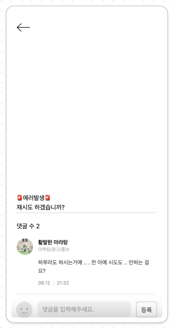 ❗ 댓글은 정상적으로 가져오고 있지만, 글 상세 데이터를 가져오는 중 에러가 발생해 화면이 아예 터져버렸다. 따로 에러 처리를 하지 않아, 빈 화면이 출력되고 있는데, 유저 입장에서는 로딩중인지, 에러가 발생한건지, 화면이 넘어가긴 한건지 알 수 없어, 매우 큰 불편함이 생길것이다.