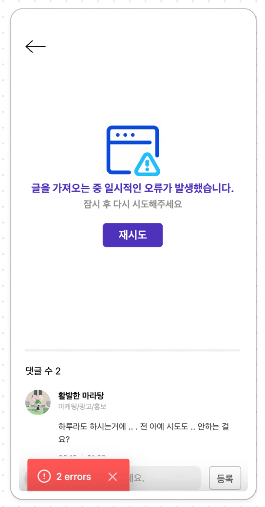 이제 다시 에러를 발생시켜보면, 전과 달리 댓글을 가져오는 API는 정상적으로 작동하여 화면에 잘 출력되고, 에러가 발생한 글 상세 API 부분만 에러 처리가 된 것을 볼 수 있다. 이를 통해 사용자는 앱이 완전히 멈춘 것이 아니라 특정 부분에서 오류가 발생했음을 인지하게 되어 안심 할 수 있게 된다.