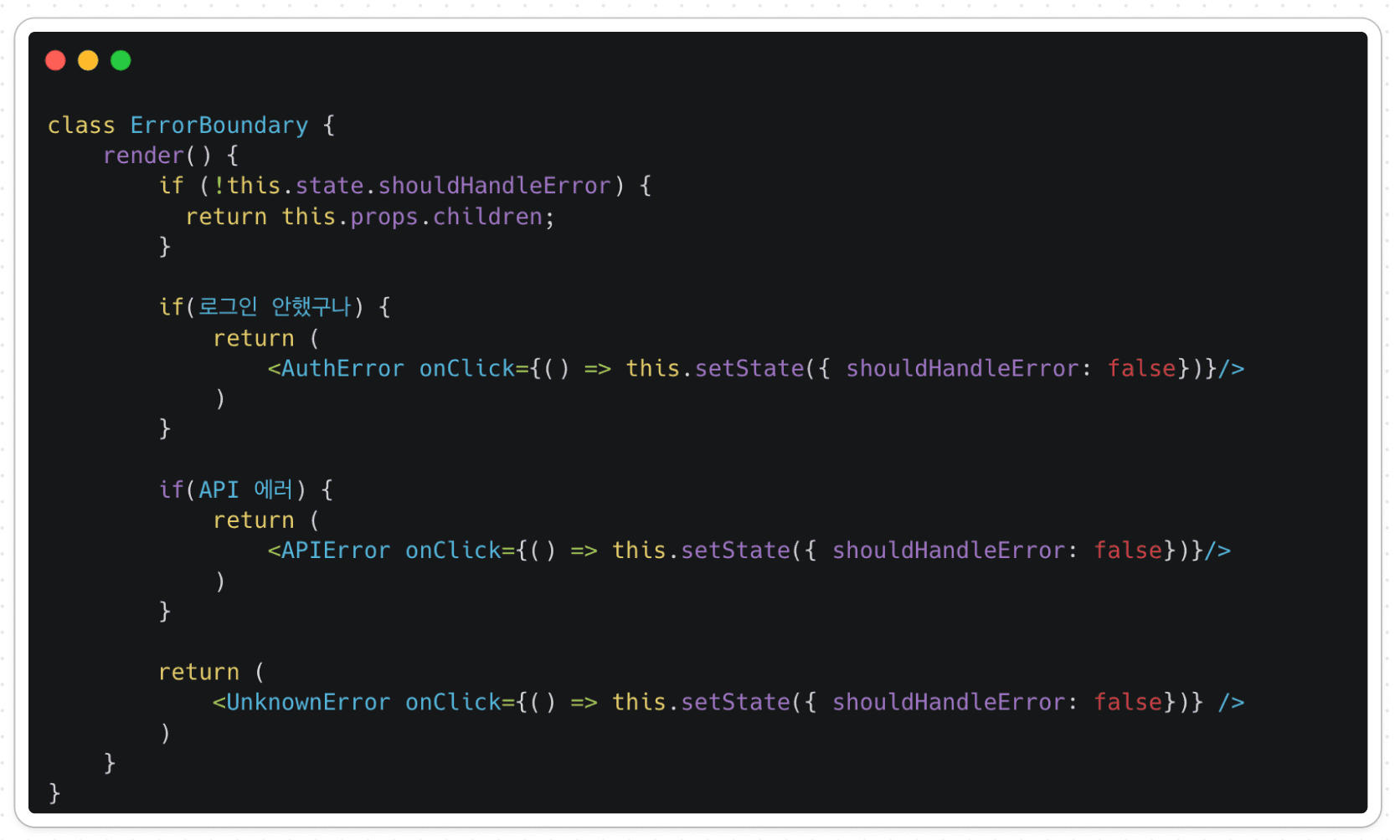 render메서드는hasError상태를 확인하여,true인 경우fallbackComponent나 기본 에러 메시지를 렌더링하고,false인 경우 자식 컴포넌트들을 그대로 렌더링한다.