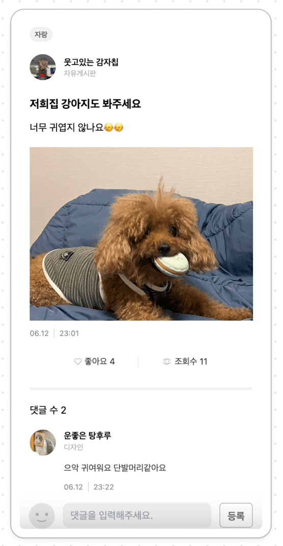 해당 화면은 커뮤니티페이지에서 보여지는 상세 글 조회 페이지이다. 해당 화면을 토대로 API 데이터 응답을 미리 예측해서 데이터를 정리해보면,
