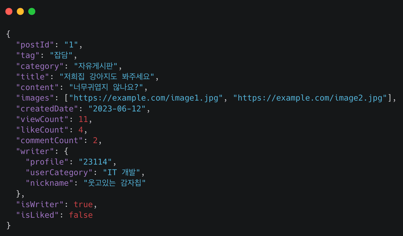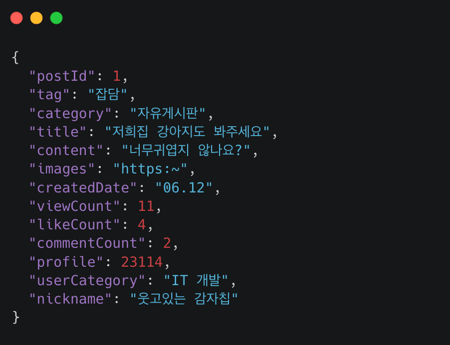 실제로 내려온 데이터 형식만 봐도 이미지는 배열 형태, 글쓴이는 추가 depth 데이터, 기존에는 없던 isWriter와 isLiked까지 이전 데이터 형식과는 크게 차이가 발생 한 것을 볼 수 있다.