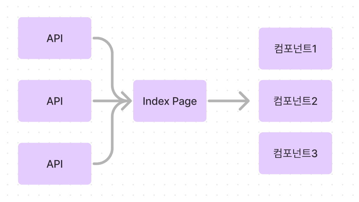 즉, Index 페이지에서 API로 받아온 모든 데이터를 처리하여 각 컴포넌트에 적절하게 전달해야 하는데, 컴포넌트 1에는 어떤 데이터를 넘겨줘야 하고, 컴포넌트 2에는 어떤 데이터를 넘겨줘야 하는지 결정한 후, 데이터를 가공하여 정확한 Props를 내려주는 작업이 필요했고, API가 변경되면 이러한 데이터 가공 작업을 처음부터 다시 수행해야 했다.