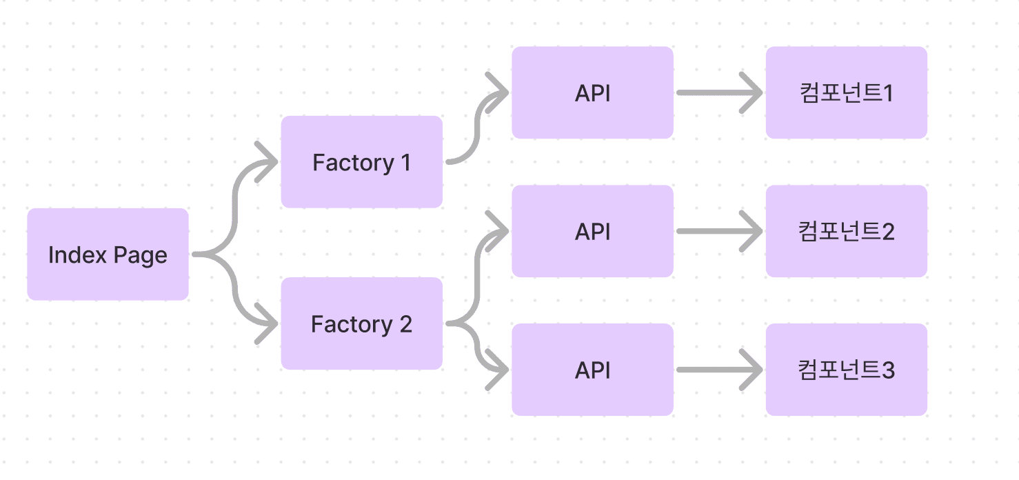 따라서 Index에서의 API 요청, 데이터 가공작업, 자식 컴포넌트의 코드 변경 등 책임을 최소화하기 위해, API 데이터가 어떻게 내려오는지에 대한 관심사는 모두 Factory 함수에게 넘겨주고, 컴포넌트에서는 Factory에서 화면을 그리는 데 필요한 데이터들만 그대로 받아서 바로 사용 할 수 있도록 변경하고자 했다.