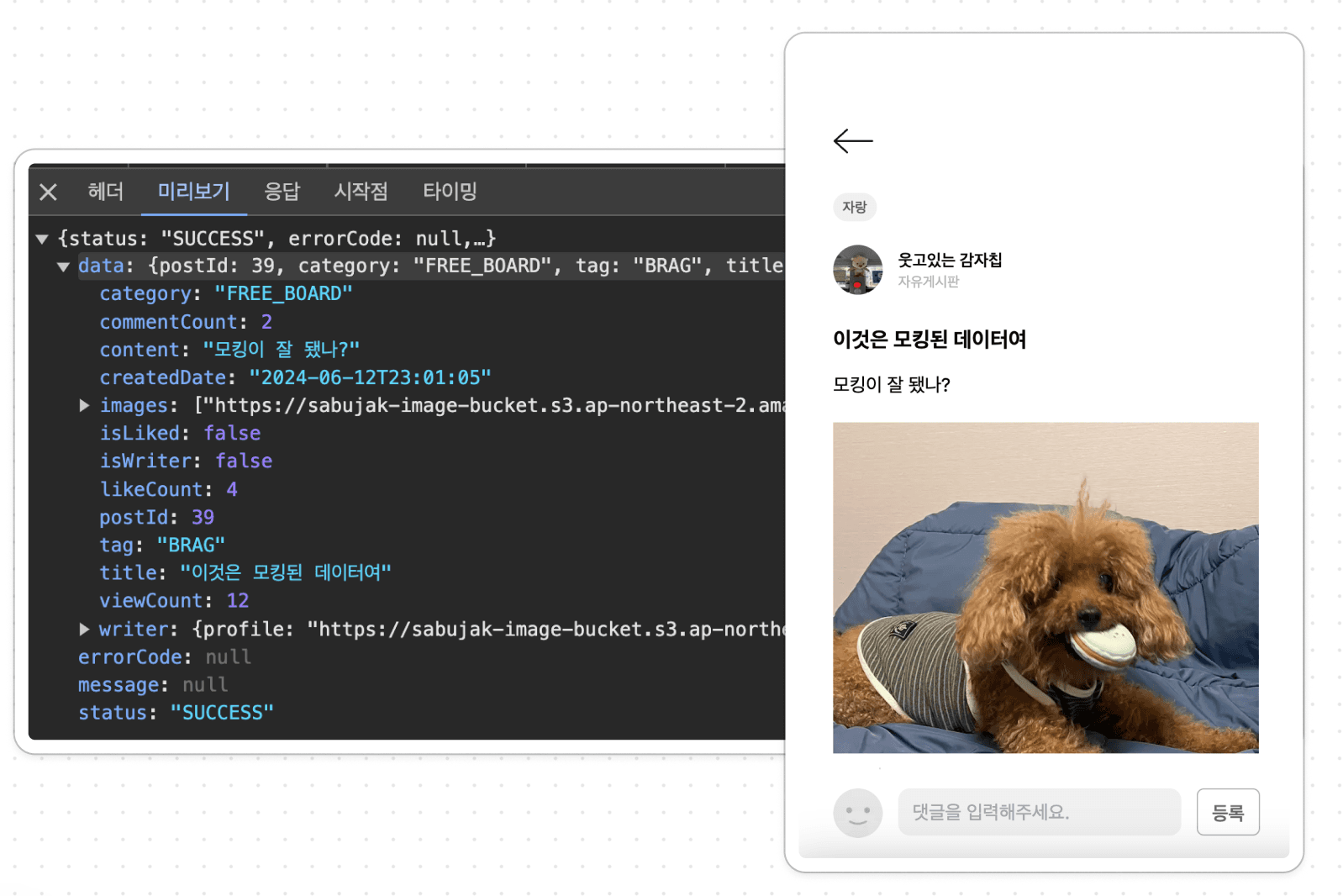 따라서 유일한 해결책은 API 응답 데이터를 예상하여 모킹하는 것이었다. 하지만 이러한 방식으로 예측된 데이터 모델을 기반으로 코드를 구현하다 보니, 실제 API가 확정되면 코드를 다시 작성해야 하는 번거로움이 발생했다.