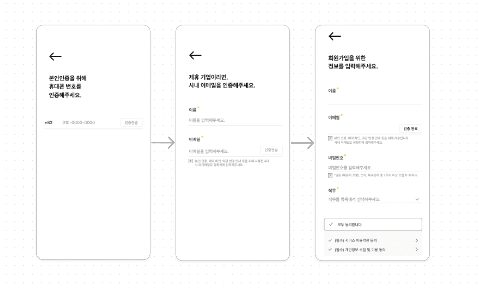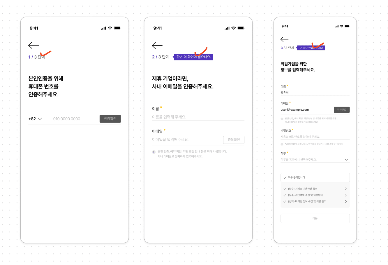 ❗ 따라서 UI/UX 팀에게 해당 문제를 제기하고, 회원가입 중 유저가 어느정도 진행됐는지 확인 할 수 있는 디자인을 요청했고, 프로젝트에 적용 시켜 혹시 모를 회원가입 유저 이탈을 방지 할 수 있도록 했다.
