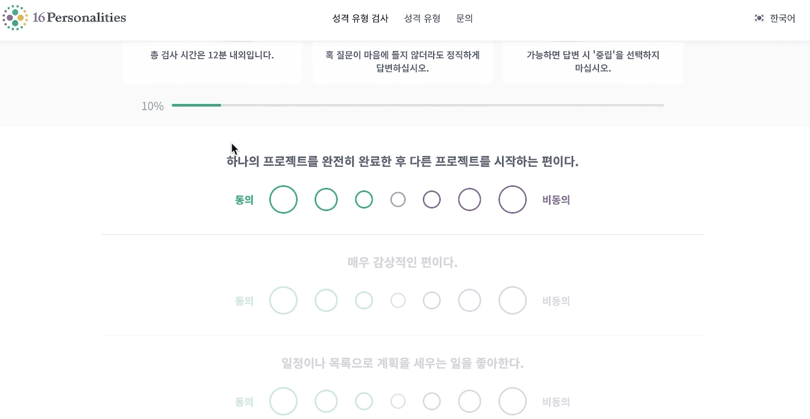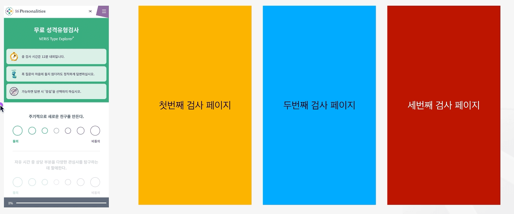 앞서 예시에서의 MBTI 페이지에서는 진행상황을 시각적으로 표시하여 유저가 현재 어느정도 참고 끝까지 설문을 완료 할 수 있도록 해주었다.