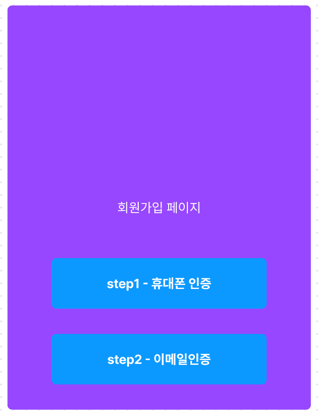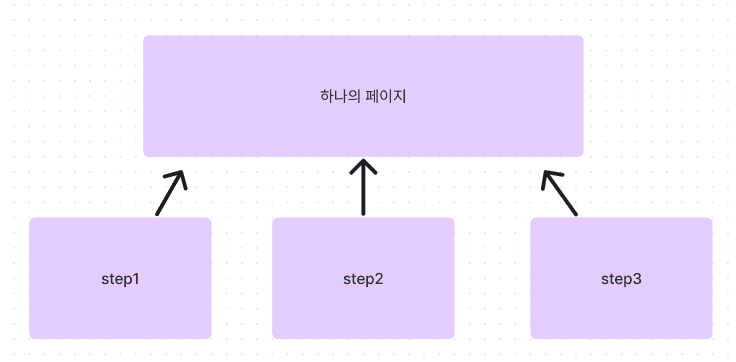 💡 내가 생각한 방식은 한 페이지 안에서 step 상태를 이용해 각 단계별 컴포넌트로 분기처리 하는 방식이다. 해당 방식은 하나의 회원가입 페이지가 존재하고, 모든 회원가입에 필요한 데이터는 회원가입 페이지에서만 관리된다.