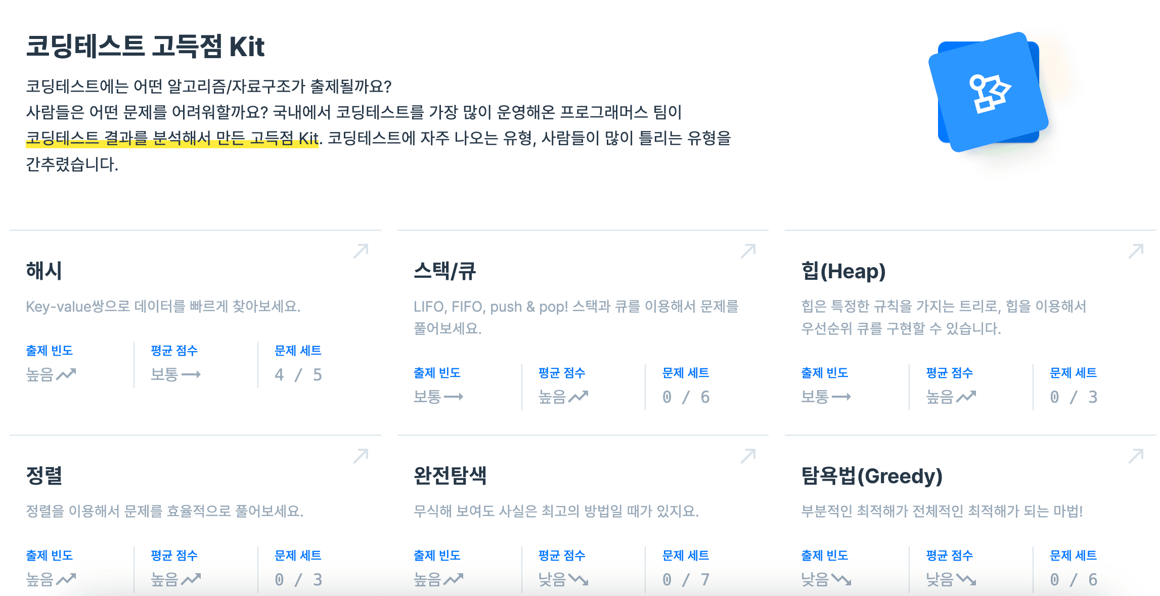 코딩테스트 풀이 연습은 주로 프로그래머스를 이용해 준비했습니다. 대부분 "알고리즘 고득점 Kit"를 추천하지만, 저같은 경우 알고리즘 고득점 Kit 보다는 확실히 나올 것 같은 알고리즘 유형만 집중적으로 푸는 전략을 택했습니다. 사실 코딩테스트 준비를 많이 하지 못했고, 자신감도 부족했던 탓에 고급 알고리즘보다는 문자열 처리나 단순 구현과 같은 기본적인 알고리즘 유형에 집중했던 것 같습니다. 이러한 방식이 저에게는 더 실용적이었고, 효율적으로 준비할 수 있는 방법이었습니다.