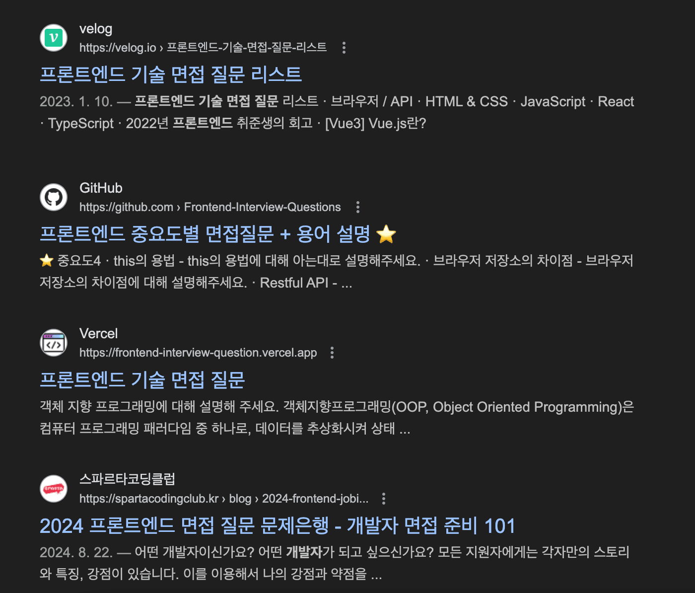 기술면접에서는 기본적인 CS 지식을 묻는 질문과 함께, 코딩테스트 검증, 프로젝트 경험에 관한 질문들이 주로 나옵니다. CS 지식 질문은 구글에서 “프론트엔드 개발자 필수 기술면접 질문”을 검색하면 다양한 질문을 찾을 수 있으며, 이런 질문들은 반드시 이해하고 외워야 할 내용입니다. 물론 이 준비는 시간이 많이 걸리기 때문에, 코딩테스트 준비처럼 꾸준히 학습하고, 언제든지 답변할 수 있는 실력을 갖추는 것이 중요합니다.