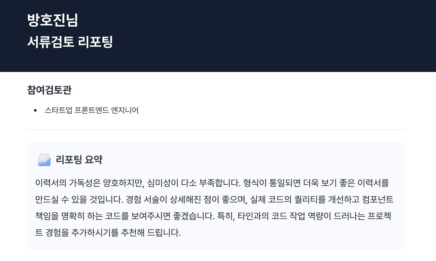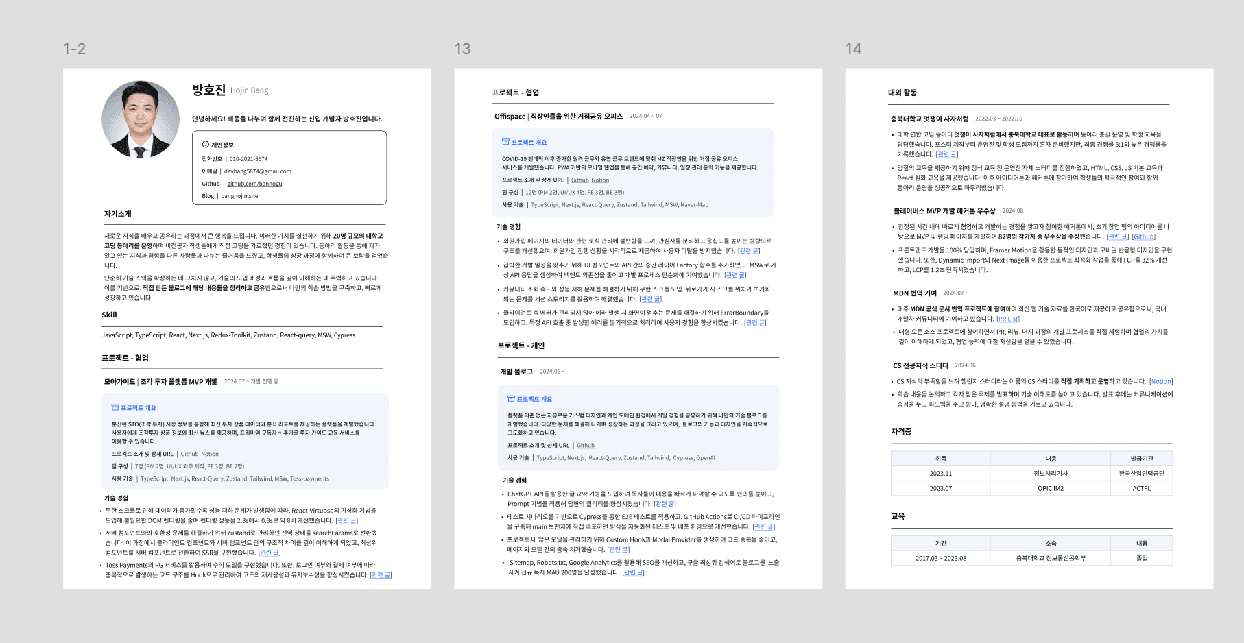 서류 전형은 보통 이력서, 포트폴리오, 자기소개서로 구성되지만, 저는 직무 경험과 개발에 대한 열정이 잘 드러난 이력서가 있다면 포트폴리오를 충분히 대체할 수 있다고 생각합니다. 많은 지원자가 유사한 프로젝트와 비슷한 기술 스택을 나열하는 경우가 많아, 단순히 프로젝트를 나열하는 포트폴리오에는 큰 메리트를 느끼지 못한다는 얘기를 자주 들었는데요. 따라서 포트폴리오에 많은 시간을 투자하기보다는 이력서에 선택과 집중하는 전략을 택했습니다.