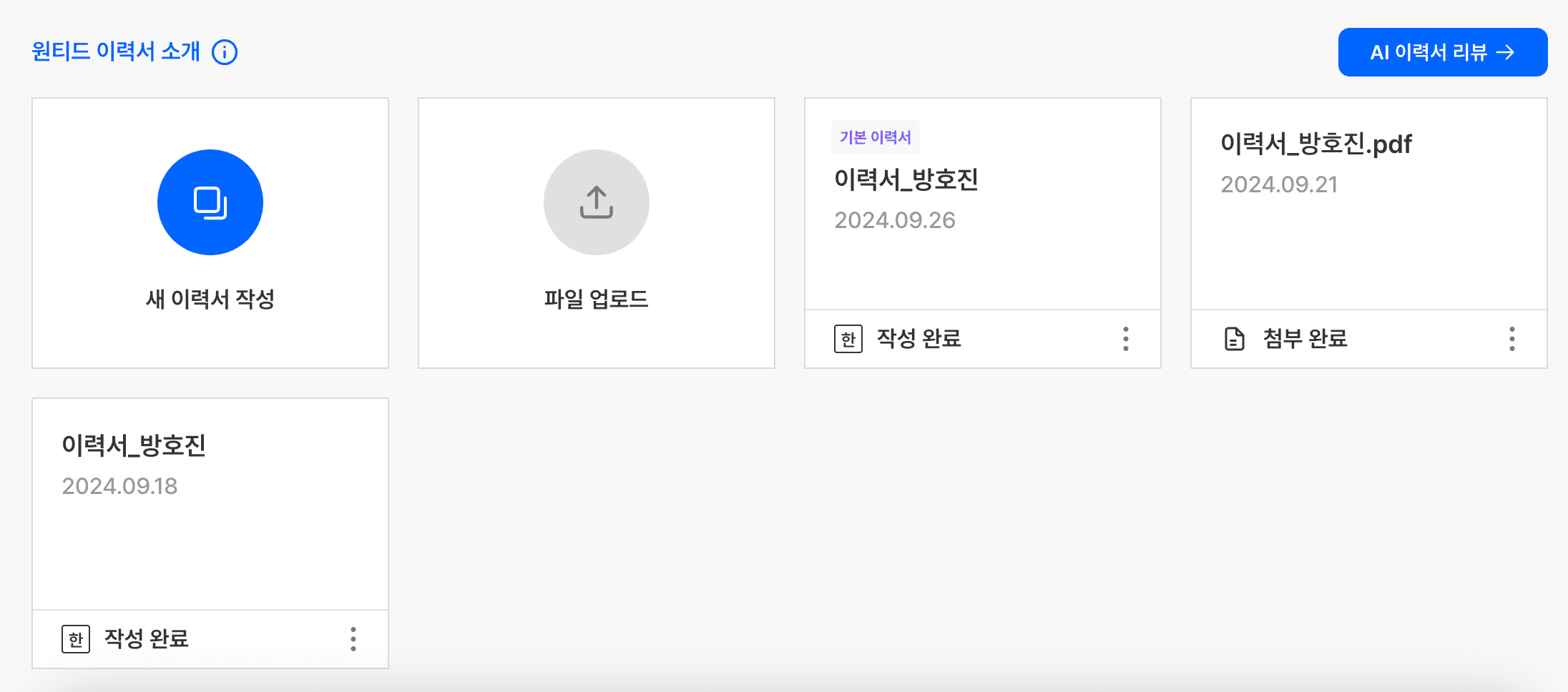 하지만 여러 차례 면접을 본 결과, 사실 대부분의 면접관님들께서 플랫폼 자체 이력서만 보면서 면접에 임하는 경우가 훨신 많았습니다. 면접시에는 원티드, 점핏, 잡코리아 등 플랫폼 지원서를 중점적으로 보기 때문에, 개인적으로 제작한 이력서에는 너무 많은 시간을 쏟지를 않기를 바랍니다.